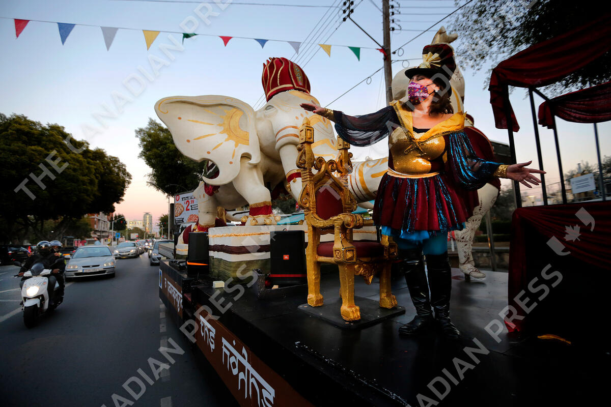 Skevi Antoniadou municipality official in charge of organizing Carnival festivities carnival, gestures to onlookers as the main float of King Carnival passes along the main thoroughfares of southern coastal city of Limassol, Cyprus, Thursday, March 4, 2021. Limassol's municipal authorities aren't letting the festive spirit completely wither away, as they're organizing a series of events conforming to coronavirus health safety protocols, culminating in an outing of King Carnival lead float that marks the theme of the entire period of festivities.(AP Photo/Petros Karadjias)