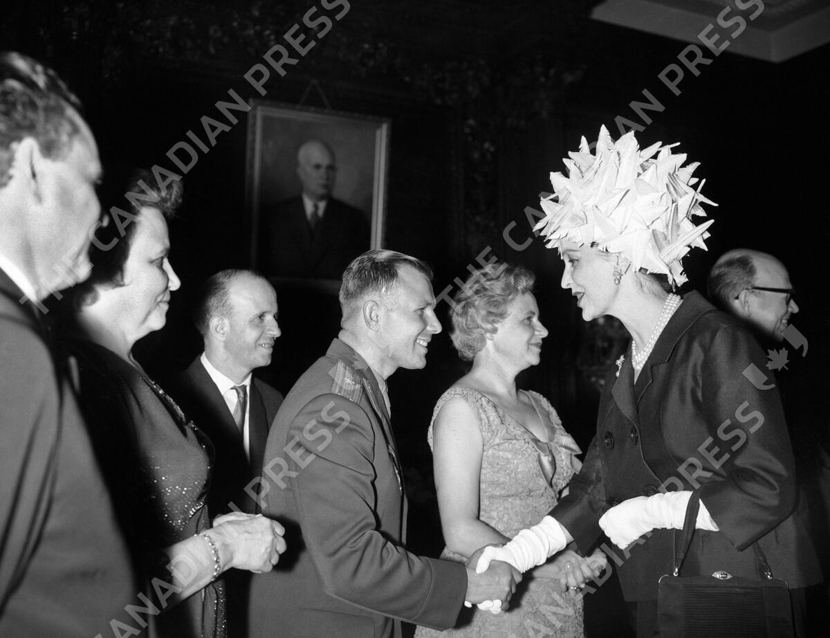 FILE - In this Tuesday, July 11, 1961 file photo, Mrs. John Profumo, formerly actress Valerie Hobson, now the wife of the Secretary of State for War, shakes hands with Major Yuri Gagarin, Russia's cosmonaut, at a reception given in Gagarin's honor at the Soviet Embassy in London. The successful one-orbit flight on April 12, 1961 made the 27-year-old Gagarin a national hero and cemented Soviet supremacy in space until the United States put a man on the moon more than eight years later. (AP Photo/Bob Dear, File)