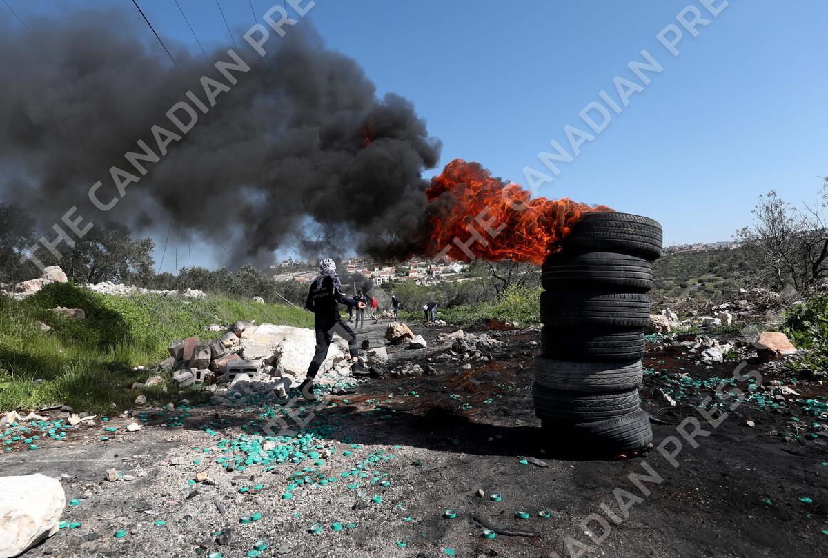 NABLUS, Feb. 26, 2021 Palestinian protesters clash with Israeli soldiers after a protest against the expanding of Jewish settlements in Kufr Qadoom village near the West Bank city of Nablus, Feb. 26, 2021. (Photo by Ayman Nobani/Xinhua) (Credit Image: © Ayman Nobani/Xinhua via ZUMA Press)
