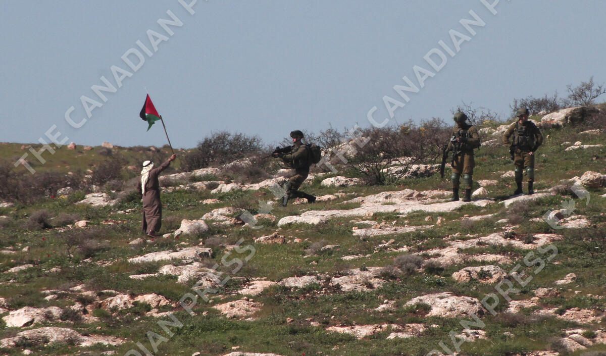 NABLUS, Feb. 26, 2021 An Israeli soldier aims his weapon at a Palestinian protester during clashes following a protest against the expansion of Jewish settlements in the West Bank village of Beit Dajan, east of Nablus, Feb. 26, 2021. (Photo by Nidal Eshtayeh/Xinhua) (Credit Image: © Nidal Eshtayeh/Xinhua via ZUMA Press)