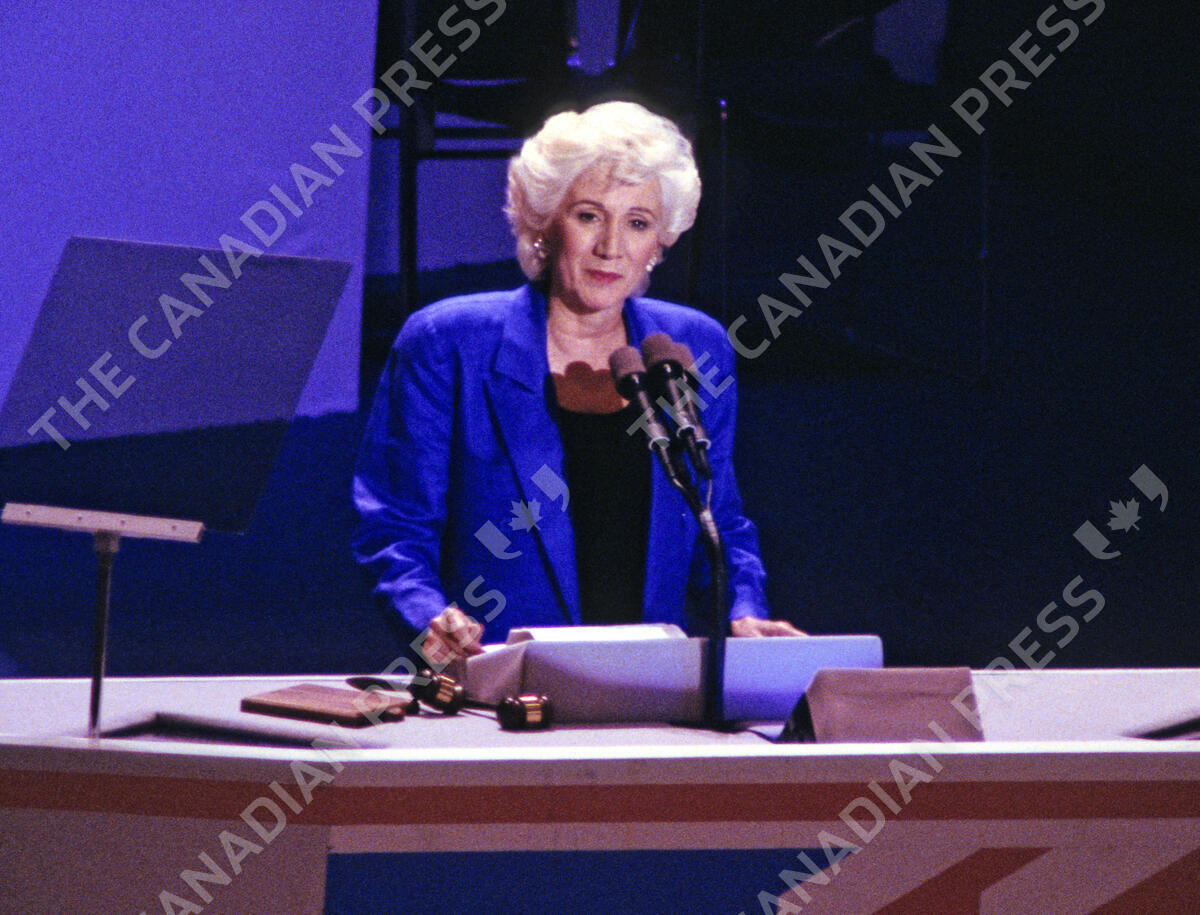 File photo - Oscar Award-winning actress Olympia Dukakis, makes remarks supporting her cousin, Governor Michael Dukakis (Democrat of Massachusetts), the 1988 Democratic Party nominee for President of the United States, at the 1988 Democratic National Convention in the Omni Coliseum in Atlanta, Georgia on July 21, 1988. - Olympia Dukakis, a character actress who won an Oscar for her role as an overbearing mother in the romantic comedy "Moonstruck," died Saturday at the age of 89. Photo by Arnie Sachs / CNP /ABACAPRESS.COM
