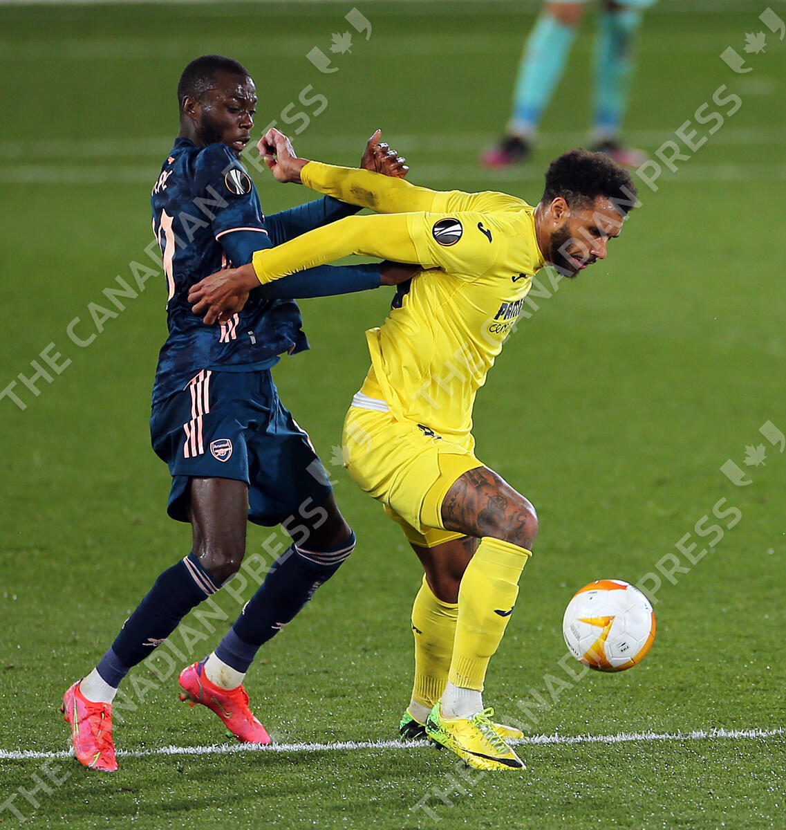 Villarreal's Etienne Capoue appears to catch Arsenal’s Nicolas Pepe in the face before being shown a yellow card during the UEFA Europa League Semi Final First Leg match at the Estadio de la Ceramica in Villarreal, Spain. Picture date: Thursday April 29, 2021.