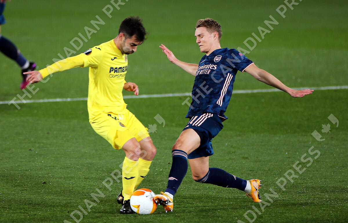 Villarreal's Manuel Trigueros and Arsenal’s Martin Odegaard (right) battle for the ball during the UEFA Europa League Semi Final First Leg match at the Estadio de la Ceramica in Villarreal, Spain. Picture date: Thursday April 29, 2021.