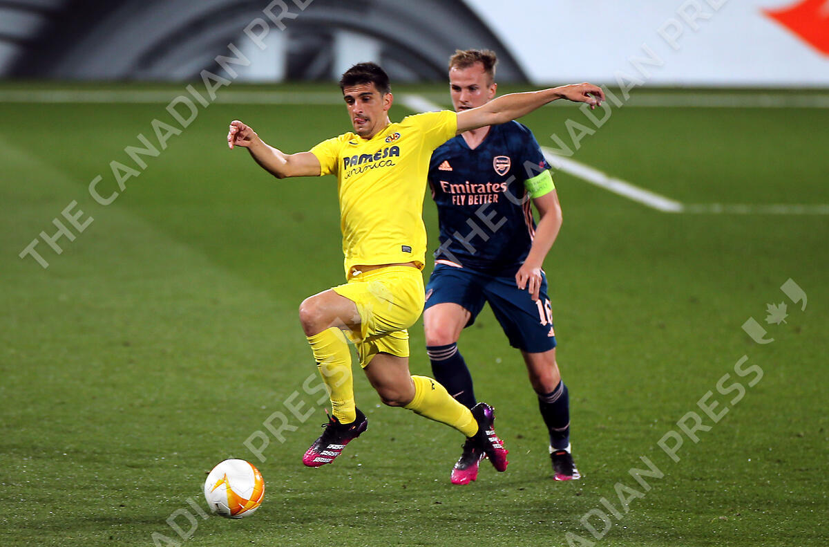 Villarreal's Moreno Gerard and Arsenal’s Rob Holding (right) during the UEFA Europa League Semi Final First Leg match at the Estadio de la Ceramica in Villarreal, Spain. Picture date: Thursday April 29, 2021.