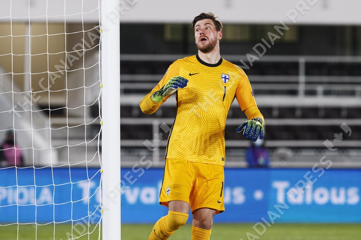 Jesse Joronen of Finland in action during football UEFA Group D FIFA World Cup 2022 qualification match Finland vs Bosnia and Herzegovina in Helsinki, Finland, on March 24, 2021. LEHTIKUVA / RONI REKOMAA - FINLAND OUT. NO THIRD PARTY SALES.