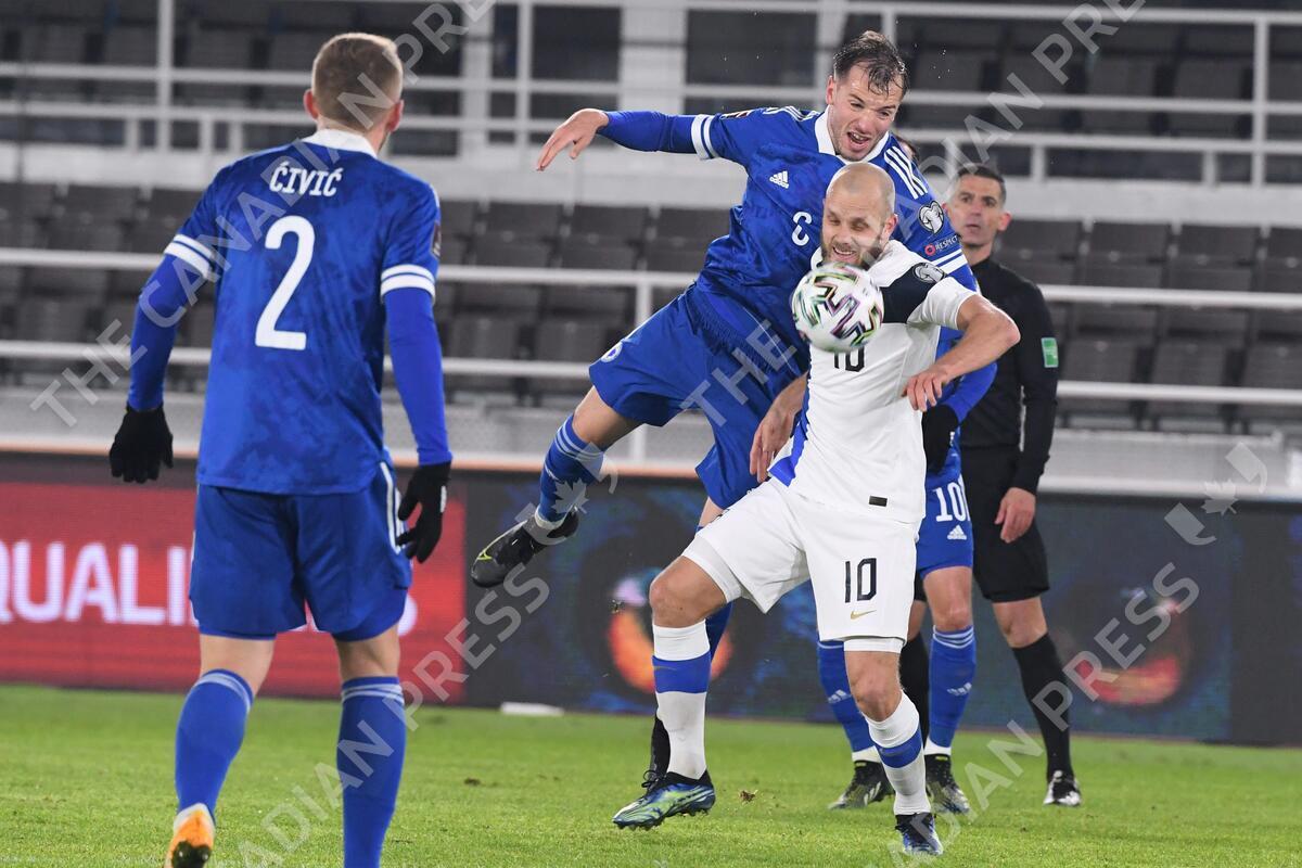 Eldar Civic of Bosnia and Herzegovina (left) watching as teammate Sinisa Sanicanin fights for the ball with Teemu Pukki of Finland (right) during football UEFA Group D FIFA World Cup 2022 qualification match Finland vs Bosnia and Herzegovina in Helsinki, Finland, on March 24, 2021. LEHTIKUVA / JUSSI NUKARI - FINLAND OUT. NO THIRD PARTY SALES.