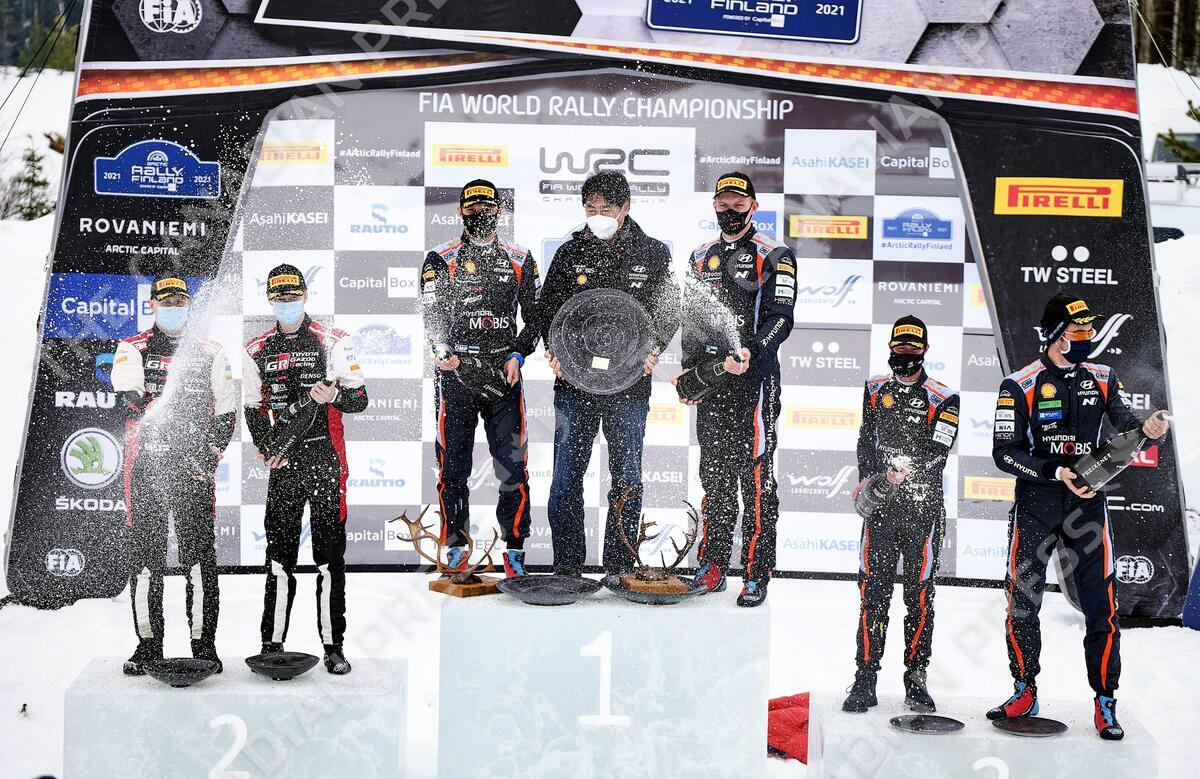 Second-placed Kalle Rovanperä (2nd L) of Finland and co-driver Jonne Halttunen (L) of Finland of the Toyota Yaris WRC team, winners Ott Tänak (3rd R) of Estonia and co-driver Martin Järveoja (3rd L) of Estonia of the Hyundai i20 Coupe WRC team together with the head of the Hyundai team Scott Noh (C) and the third-placed Belgian Thierry Neuville and co-driver Martijn Wydaeghe (R) of Belgium of the Hyundai i20 Coupe WRC team on the podium on the final day of the FIA WRC Arctic Lapland Rally in Rovaniemi, Finland on Sunday, 28th February, 2021. LEHTIKUVA / HANNU RAINAMO - FINLAND OUT. NO THIRD PARTY SALES.
