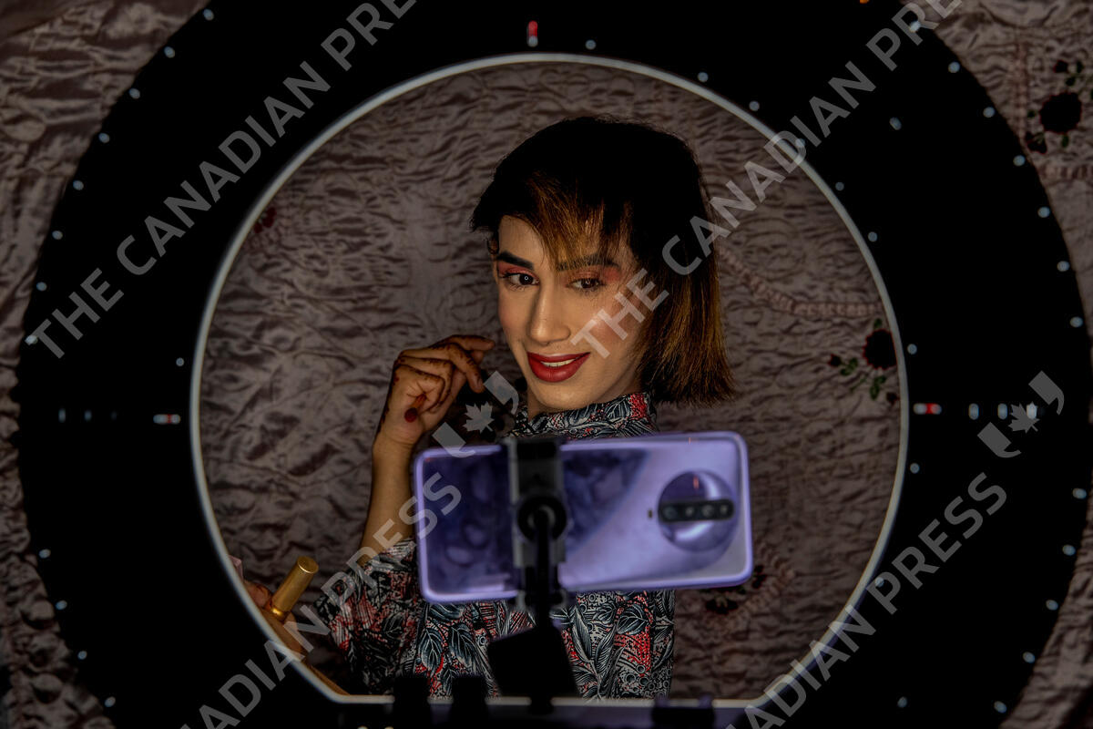 A transgender Kashmiri Manu Babo makes an instagram video at home in Srinagar, Indian controlled Kashmir, Wednesday, June 9, 2021. Babo is a 19-year-old self-taught make-up artist living who is bending the rules of conservative Kashmiri society. Her instagram account reads "A Proud Transgender". She received assignments even during the pandemic from her instagram and YouTube accounts. (AP Photo/ Dar Yasin)