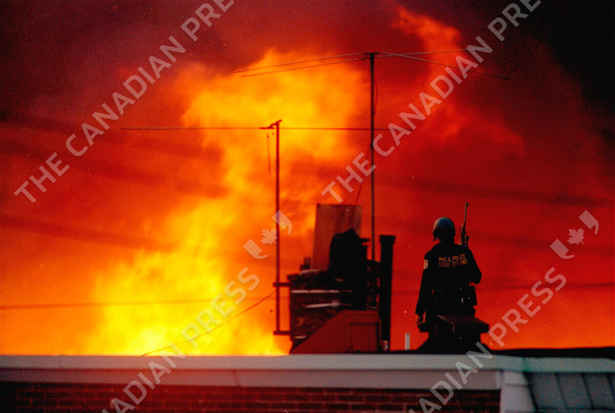 FILE - In this May, 1985 file photo, a Philadelphia policeman is seen on a rooftop as flames rise from a row of burning homes beyond, in Philadelphia. The fire started when police dropped a bomb onto the house of the militant group MOVE, on May 13, 1985 and fire spread throughout the area. A day after Philadelphia's health commissioner was forced to resign over the cremation of partial remains thought to belong to victims of a 1985 bombing of the headquarters of a Black organization, the city now says those victims' remains were never destroyed. City officials told the victims' family Friday, May 14, 2021 that a subordinate had disobeyed Health Commissioner Thomas Farley’s 2017 order to dispose of the remains. (AP Photo/George Widman, File)
