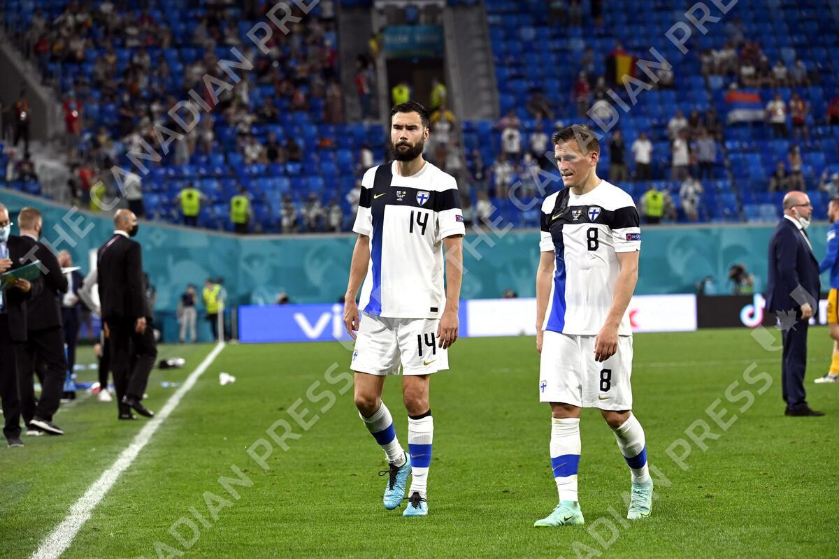 Captain Tim Sparv and Robin Lod of Team Finland dissapointed after 0-2 loss in the UEFA Euro 2020 football tournament group B match Finland vs Belgium at Saint Petersburg stadium in Saint Petersburg, Russia on June 21, 2021. LEHTIKUVA / EMMI KORHONEN - FINLAND OUT. NO THIRD PARTY SALES.