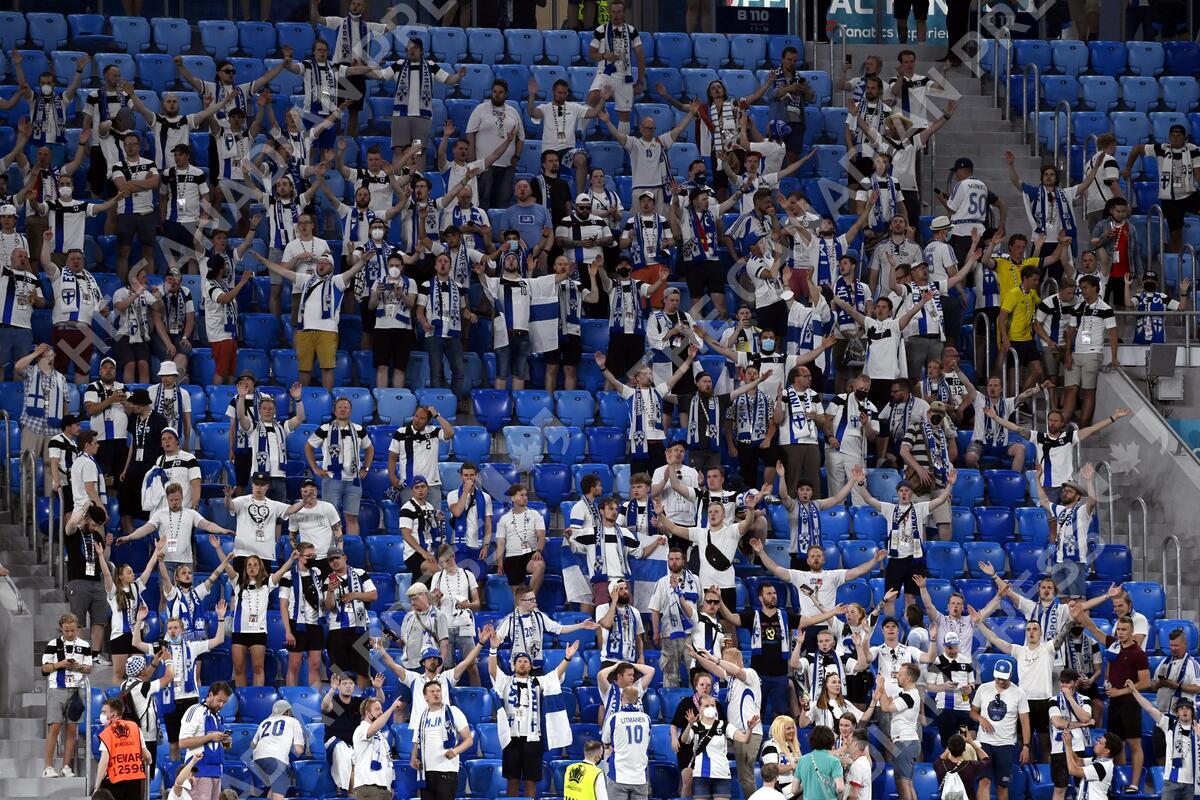 Fans of Team Finland show their support after 0-2 loss in the UEFA Euro 2020 football tournament group B match Finland vs Belgium at Saint Petersburg stadium in Saint Petersburg, Russia on June 21, 2021. LEHTIKUVA / EMMI KORHONEN - FINLAND OUT. NO THIRD PARTY SALES.