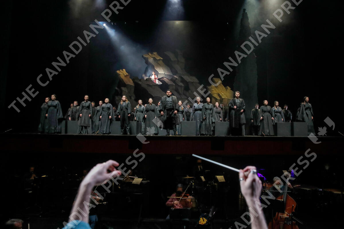Greek soprano Artemis Bogri performs during a rehearsal of "Despo-Greek Dances" Opera and dance performance in Athens, Thursday, March 4, 2021. Dozens of museum exhibitions, theater productions, discussion panels and historical re-enactments were planned in Greece for this year to commemorate the bicentennial of the 1821-1832 Greek War of Independence. But due to the coronavirus pandemic, mezzo-soprano Artemis Bogri and her fellow singers stepped onstage in an empty theater to perform the Greek National Opera’s new production of “Despo,” one of the events marking 200 years since the war that resulted in Greece’s independence from the Ottoman Empire and rebirth as a nation. (AP Photo/Thanassis Stavrakis)