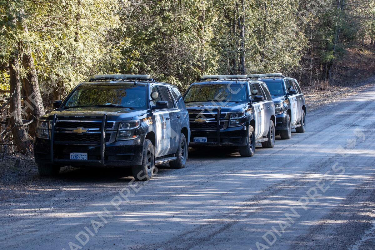 OPP Police cruisers where three-year-old Jude Walter Leyton went missing from his family near Verona, Ontario on Monday March 29, 2021. Jude went missing on March 28 from a wooded area. THE CANADIAN PRESS/Lars Hagberg