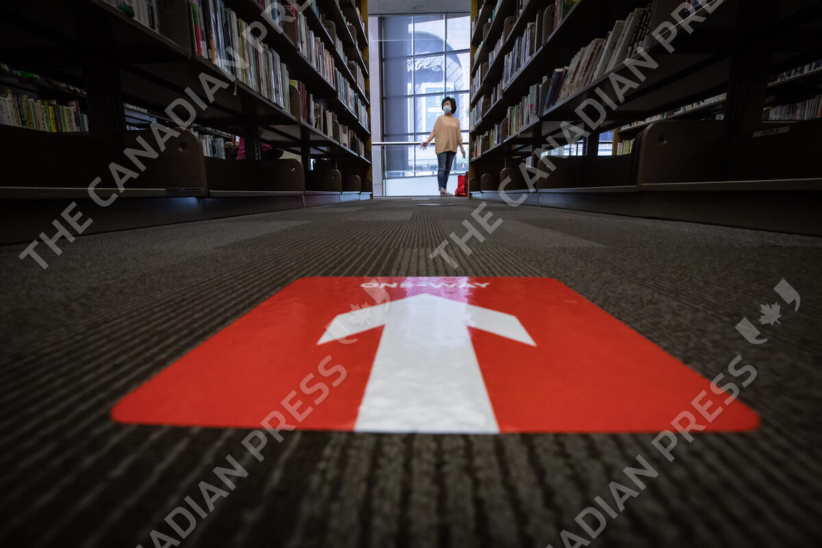 A woman wears a face mask and plastic gloves while browsing books as a sticker on the floor indicates a one-way direction of travel between shelves of books at the Vancouver Public Library's central branch, after it and four other branches reopened with limited services, in Vancouver, on July 14, 2020. As people around the world remain isolated in their homes, avoiding close contact with others and meticulously sanitizing their hands and surfaces, scientists warn there may be unintended consequences of these necessary pandemic protocols. THE CANADIAN PRESS/Darryl Dyck