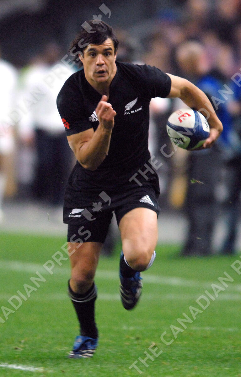 All Blacks' fly-half Dan Carter runs with the ball past French centre Yannick Jauzion during the rugby union test match, France vs New Zealand at the Stade de France, in Saint Denis, near Paris, France on November 18, 2006. New Zealand won 23-11. Photo by Gouhier-Guibbaud/Cameleon/ABACAPRESS.COM