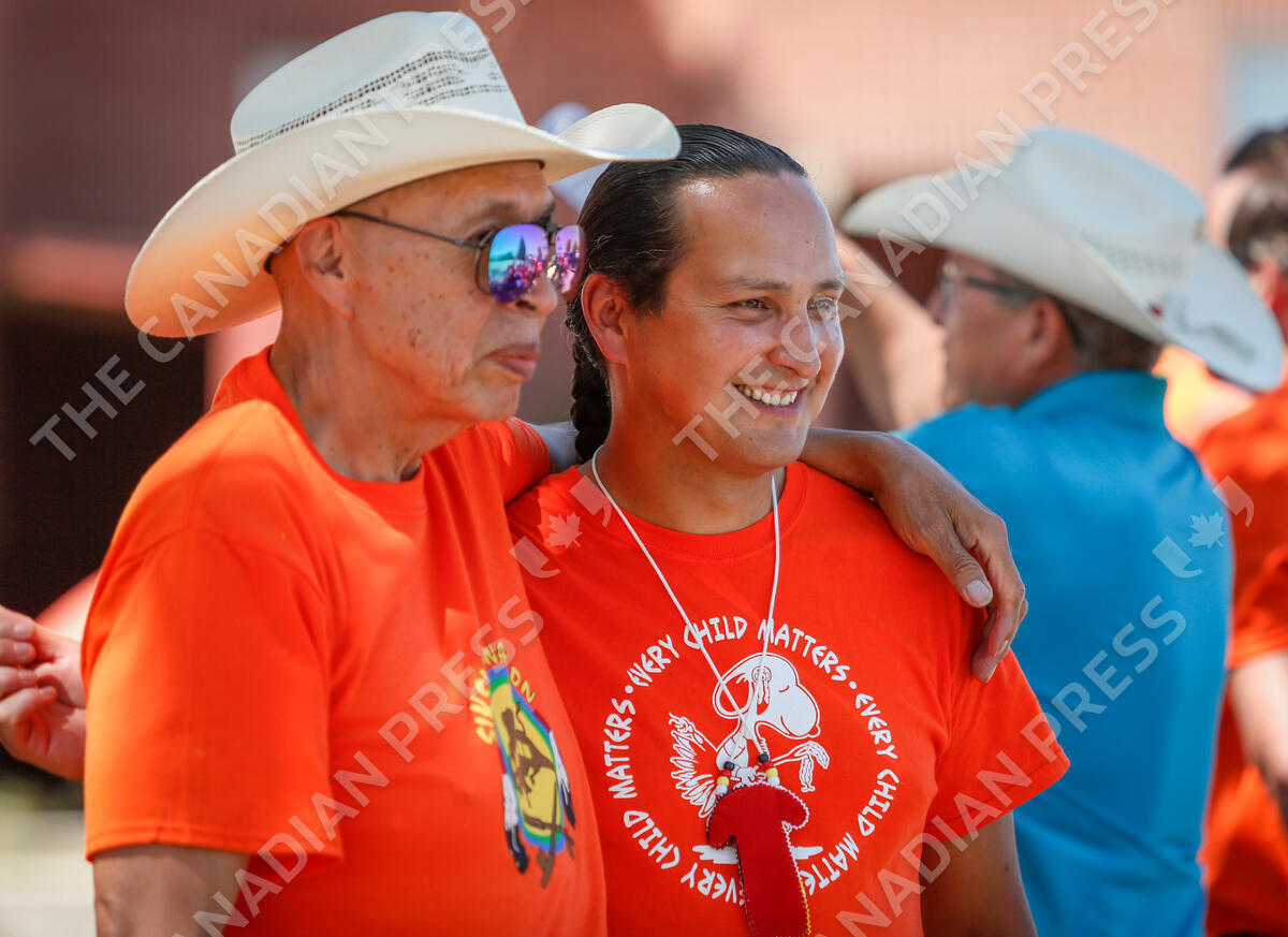 Chief Cadmus Delorme, right, of the Cowessess First Nation in Saskatchewan, poses for a photo with a Siksika band member as he attends a gathering paying tribute to victims of residential schools at Old Sun Community College, site of a former residential school, on the Siksika Nation near Gleichen, Alta., Thursday, July 1, 2021.THE CANADIAN PRESS/Jeff McIntosh