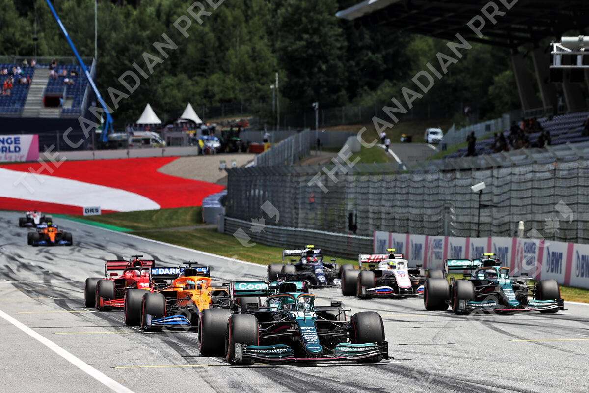 Lance Stroll (CDN) Aston Martin F1 Team AMR21 and Sebastian Vettel (GER) Aston Martin F1 Team AMR21 - practice starts.