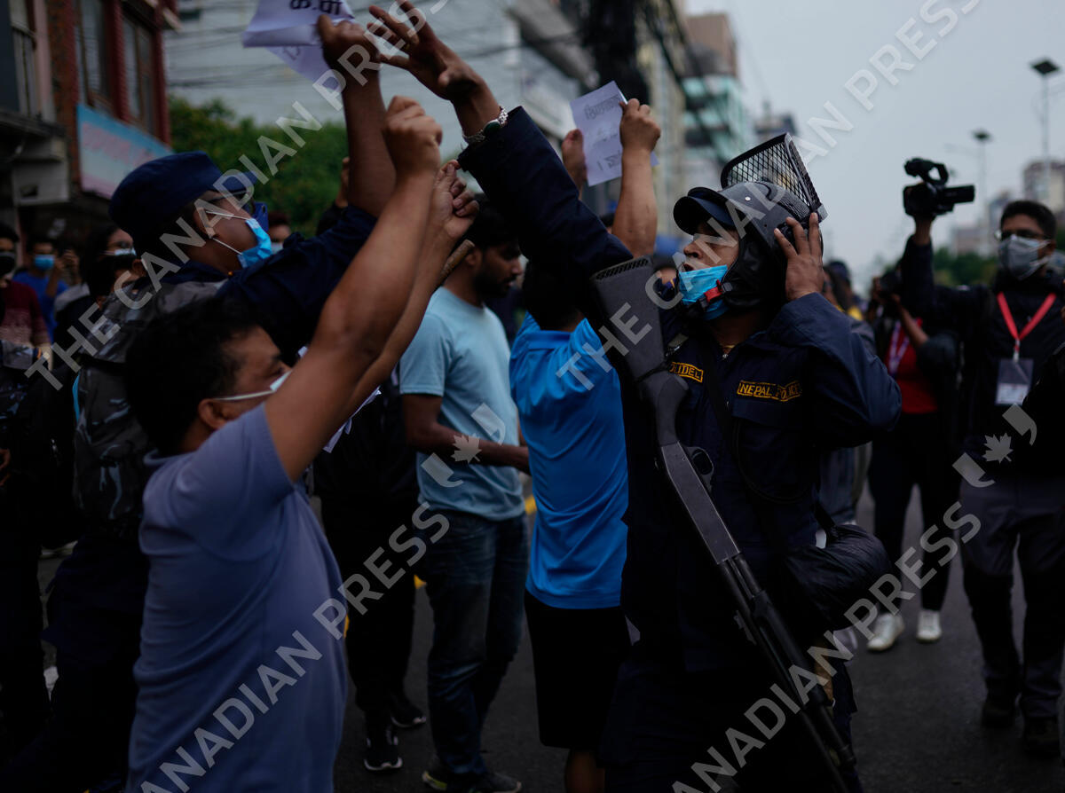 June 30, 2021, Kathmandu, Nepal: Police personnel snatch placards against Nepal’s Prime Minister KP Sharma Oli during a protest against the dissolution of Parliament, cabinet reshuffle and early elections in Kathmandu, Nepal on Wednesday, June 30, 2021. (Credit Image: © Skanda Gautam/ZUMA Wire)