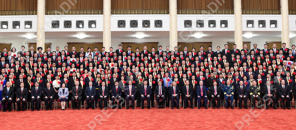 BEIJING, June 29, 2021 Chinese President Xi Jinping, also general secretary of the Communist Party of China (CPC) Central Committee and chairman of the Central Military Commission, and other leaders meet with awardees of the titles of outstanding Party members, exemplary Party workers, and advanced community-level Party organizations from across the country before the ceremony to present the July 1 Medal, the Party's highest honor, to outstanding Party members at the Great Hall of the People in Beijing, capital of China, June 29, 2021. The award ceremony of the July 1 Medal was held Tuesday morning at the Great Hall of the People in Beijing. (Credit Image: © Shen Hong/Xinhua via ZUMA Press)