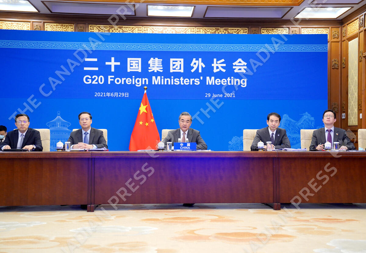 BEIJING, June 29, 2021 Chinese State Councilor and Foreign Minister Wang Yi attends a conference of the G20 foreign ministers via video link in Beijing, capital of China, June 29, 2021. (Credit Image: © Yue Yuewei/Xinhua via ZUMA Press)