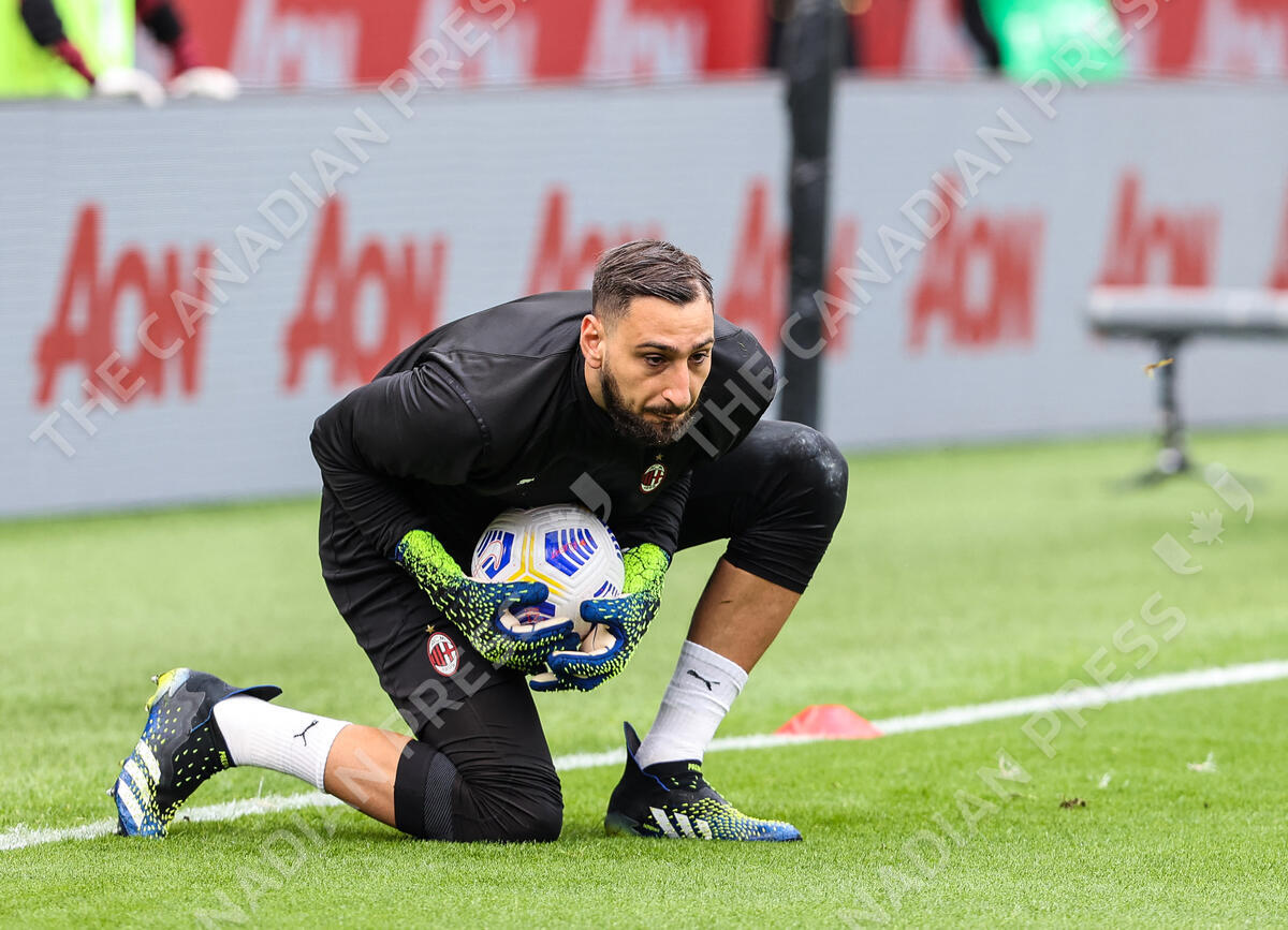 Gianluigi Donnarumma of AC Milan warms up during the Serie A 2020/21 football match between AC Milan vs Genoa CFC at the Giuseppe Meazza Stadium, Milan, Italy on April 18, 2021. Photo by FCI/Fabrizio Carabelli/LiveMedia/IPA/ABACAPRESS.COM