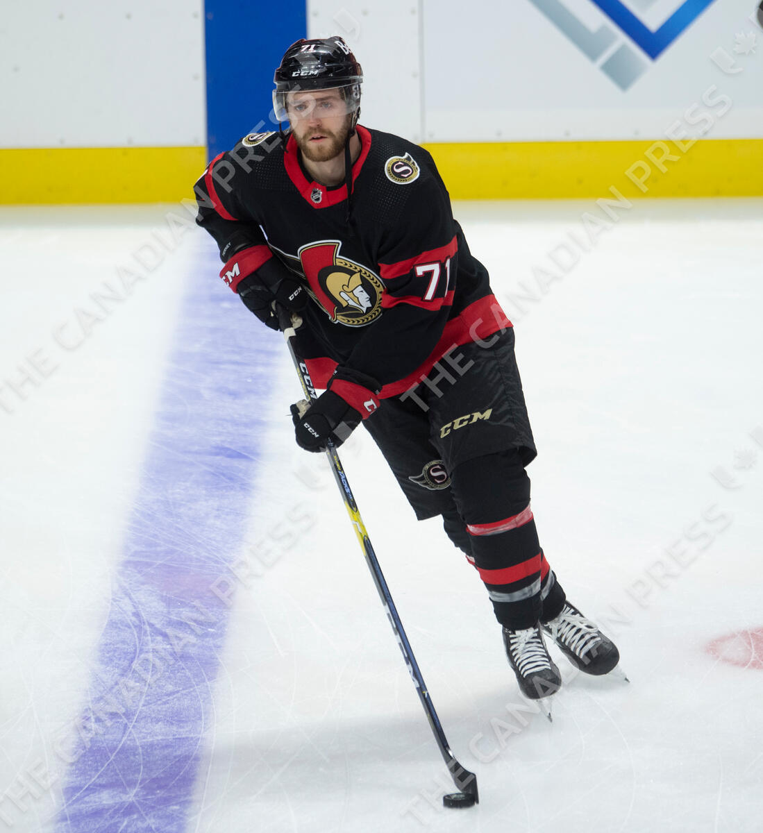 Ottawa Senators centre Chris Tierney skates during warm up Thursday February 25, 2021 in Ottawa. THE CANADIAN PRESS/Adrian Wyld