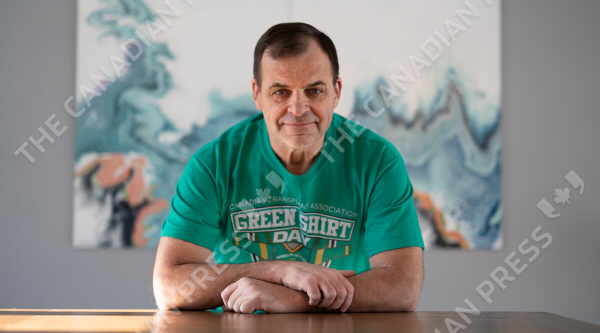 Jim Lowes, a recent living kidney donor who was inspired by Humboldt Broncos bus crash victim Logan Boulet, is photographed at his home in Burlington, Ont. on Thursday, February 25, 2021. Green Shirt Day, April 7, was started after crash that killed 16 people and coincides with the anniversary of Logan Boulet's death. Boulet's family donated his organs after the crash. THE CANADIAN PRESS/Peter Power