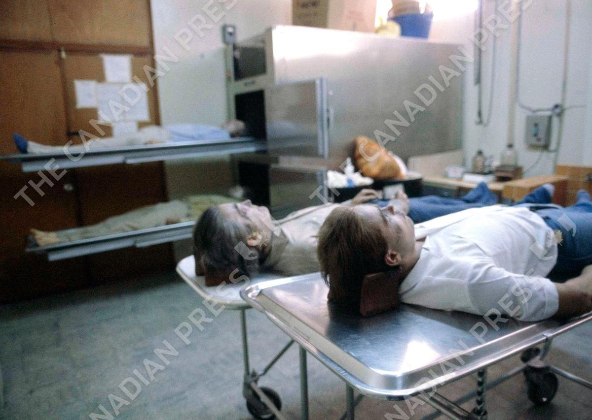 In this March 19, 1982 photo, two of the four Dutch journalists killed in the northern province of Chalatenango lie in a San Salvador, El Salvador, morgue. Jan Kuiper, Koos Koster, Hans ter Laag and Joop Willemsen were killed in 1982 while on assignment for IKON, a Dutch public TV broadcaster. Calls are mounting for Col. Mario Reyes Mena, a former Salvadoran army colonel, to be brought to justice for the killings. (AP Photo/Lenny Ignelzi)