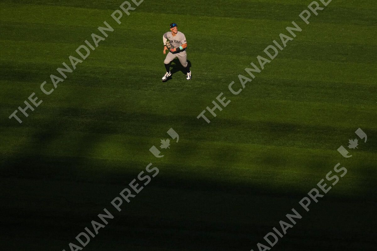 New York Yankees outfielder Aaron Judge (99) tracks a fly ball during Game 1 ALDS MLB baseball action against the Toronto Blue Jays in Toronto, on Saturday, Oct. 4, 2025. THE CANADIAN PRESS/Chris Young