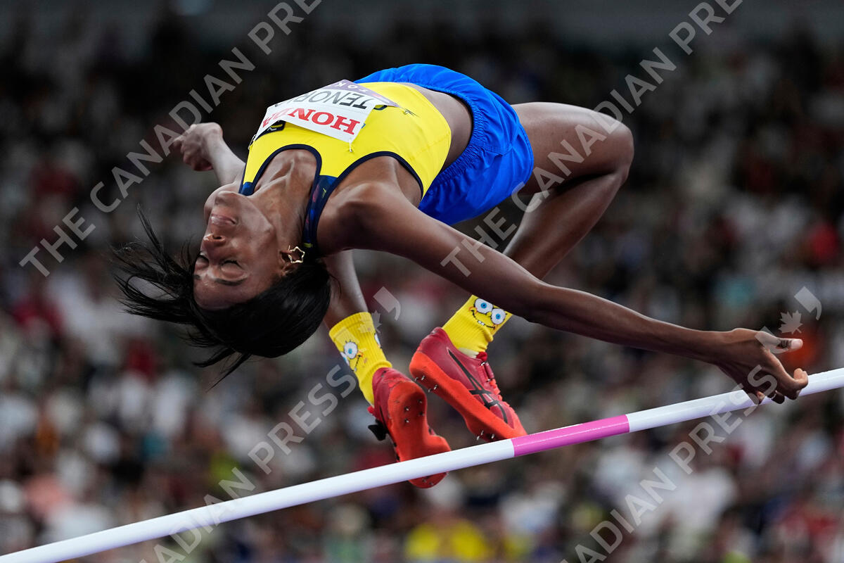 Colombia's Hellen Tenorio makes an attempt in the women's high jump qualification at the World Athletics Championships in Tokyo, Thursday, Sept. 18, 2025. (AP Photo/Matthias Schrader)