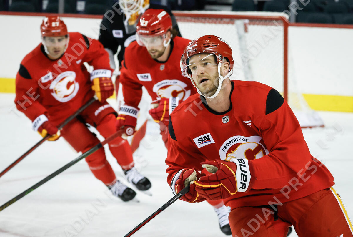 Calgary Flames' Jonathan Huberdeau, right, skates during a training camp practice in Calgary, Alta., Thursday, Sept. 18, 2025. THE CANADIAN PRESS/Jeff McIntosh
