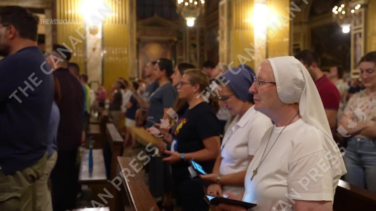 Hundreds of Catholic faithful from LGBTQ+ communities around the globe gathered at a church in Rome Friday night for a vigil ahead of their jubilee at the Vatican. (AP Video: Isaia Montelione)