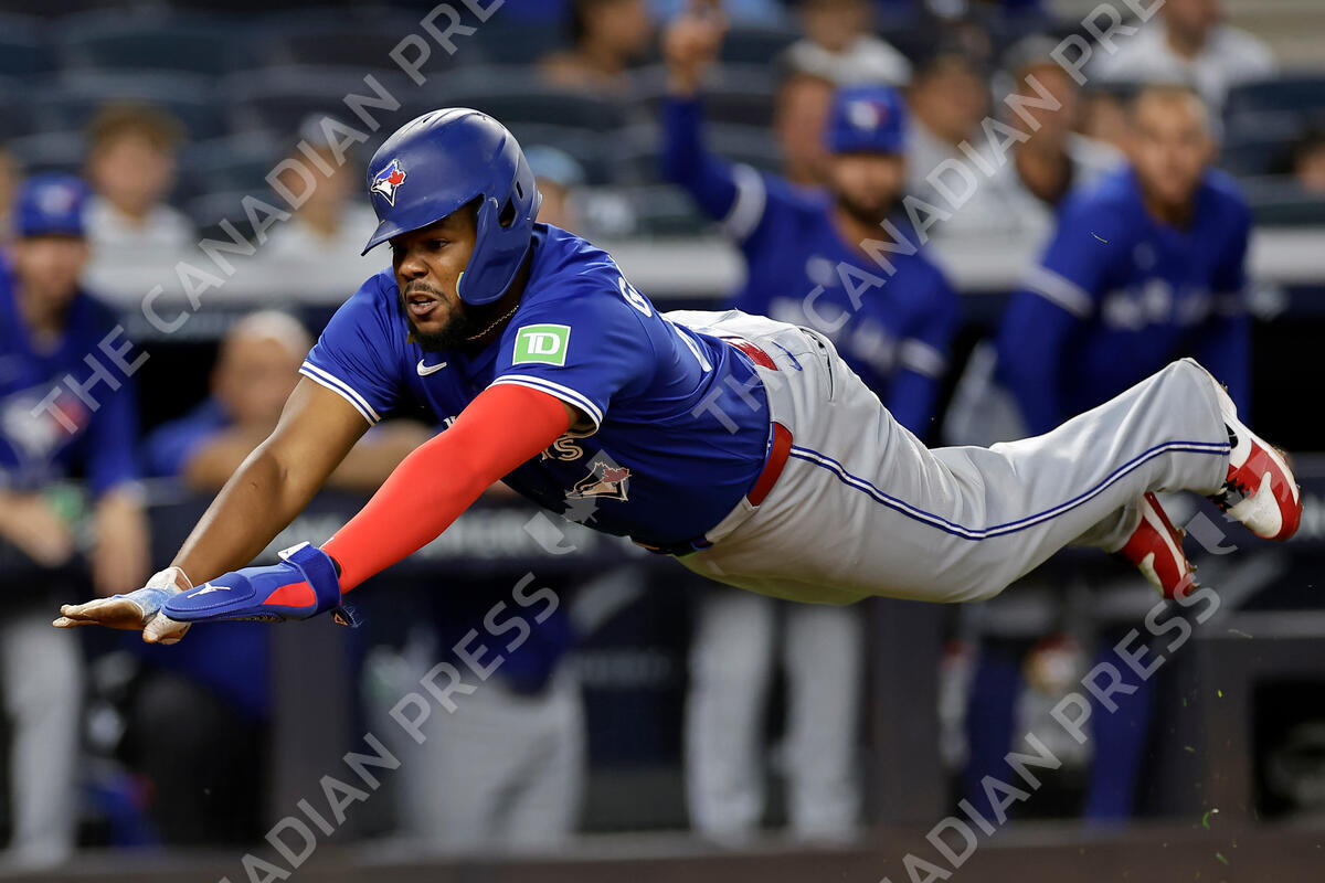 Toronto Blue Jays' Vladimir Guerrero Jr. dives home to score during the first inning of a baseball game against the New York Yankees, Friday, Sept. 5, 2025, in New York. (AP Photo/Adam Hunger)