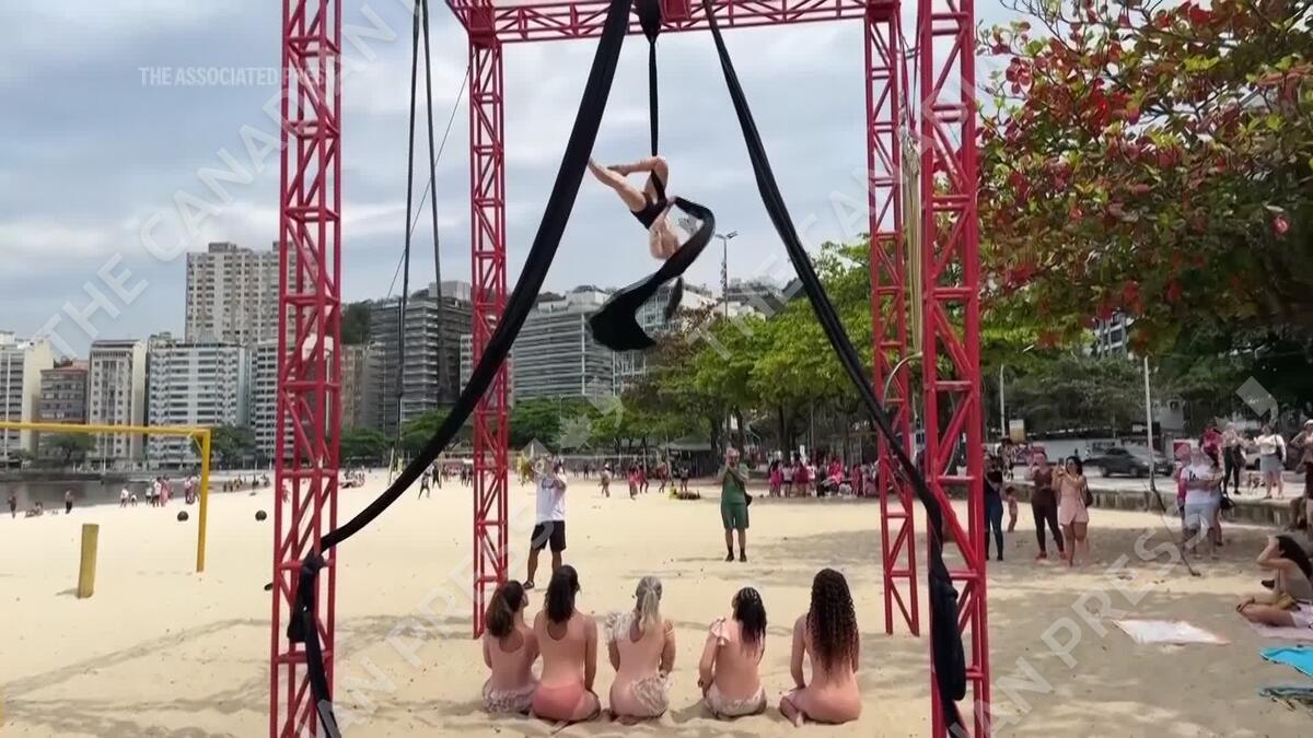 Performers twisted and twirled above the sand on a beach across the bay from Rio de Janeiro in an aerial circus show that sought to draw attention to the widespread problem of violence against women in Brazil. Six women and two men performed the piece titled “Alone we are petals, together we are roses” for the first time on Saturday in Niteroi city with Rio’s famed landmarks — the Christ the Redeemer statue and Sugarloaf Mountain — in the background. (AP Video shot by Diarlei Rodrigues and Mario Lobão)
