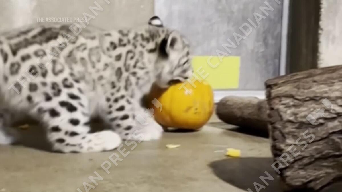 Adorable snow leopard cub gets first pumpkin experience at Michigan zoo