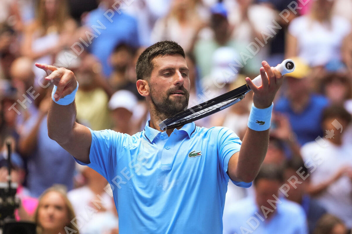 Novak Djokovic, of Serbia, pretends to play the violin after defeating Zachary Svajda, of the United States, during the second round of the U.S. Open tennis championships, Wednesday, Aug. 27, 2025, in New York. (AP Photo/Kirsty Wigglesworth)