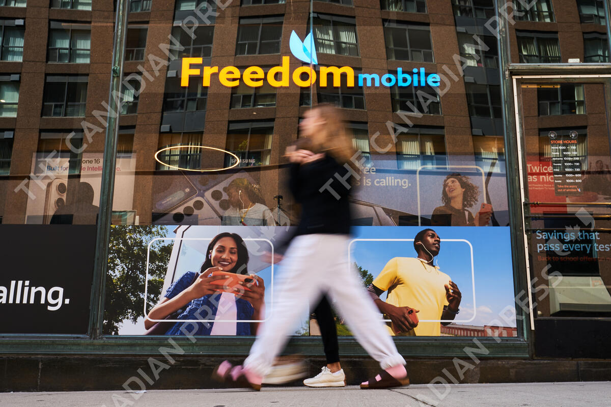 Pedestrians pass by a Freedom Mobile store in Toronto, on Tuesday, Aug. 26, 2025. THE CANADIAN PRESS/Sammy Kogan