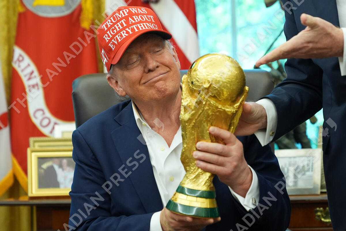 President Donald Trump holds the FIFA World Cup Winners Trophy during an announcement in the Oval Office of the White House, Friday, Aug. 22, 2025, in Washington. (AP Photo/Jacquelyn Martin)
