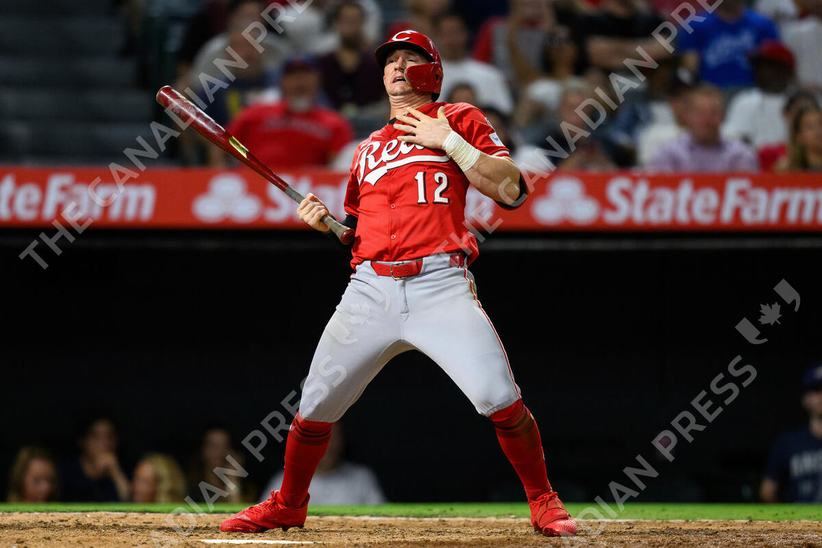 Cincinnati Reds' Austin Hays reacts after an inside pitch during the ninth inning of a baseball game against the Los Angeles Angels Wednesday, Aug. 20, 2025, in Anaheim, Calif. (AP Photo/William Liang)