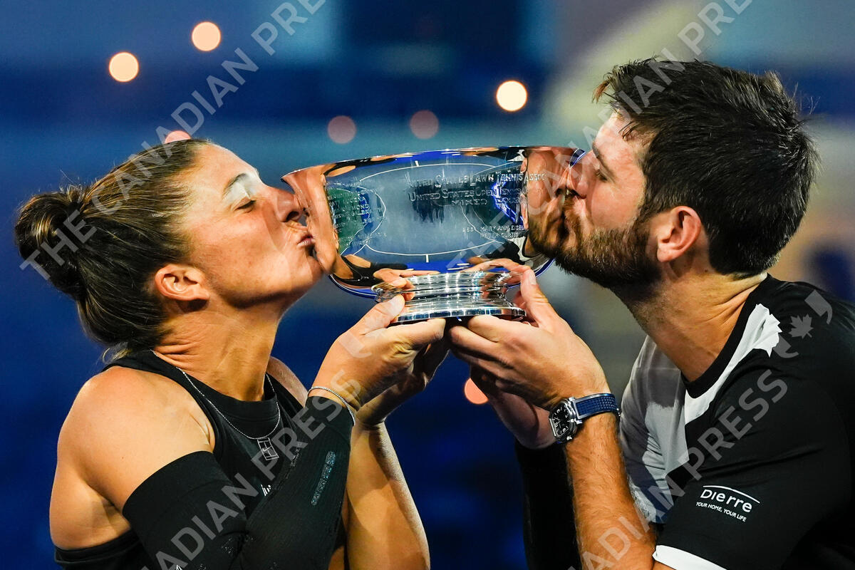 Andrea Vavassori, right, of Italy, and Sara Errani, left, of Italy, hold up the championship trophy after defeating Iga Swiatek, of Poland, and Casper Ruud, of Norway, in the mixed doubles final at the U.S. Open tennis championships, Wednesday, Aug. 20, 2025, in New York. (AP Photo/Yuki Iwamura)