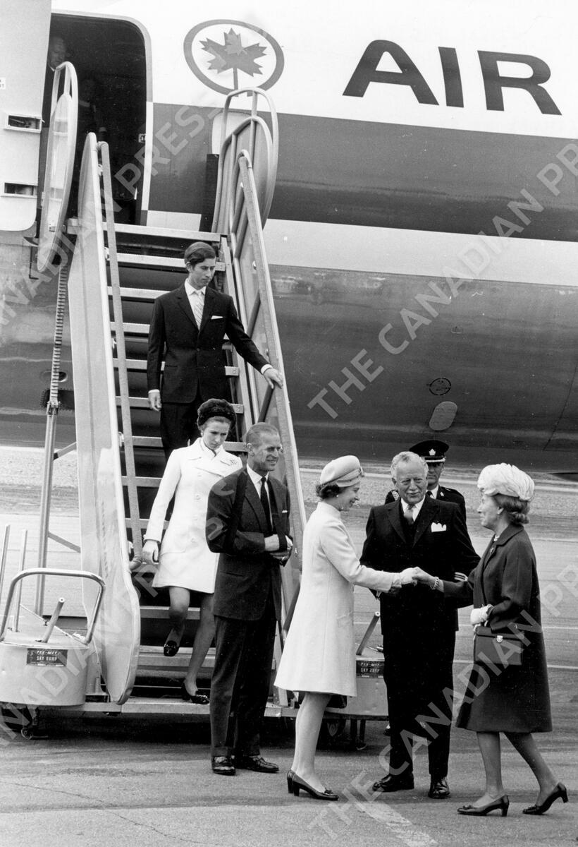 JULY 5, 1970 -- ROYAL TOUR TO NWT BEGINS -- Queen Elizabeth II, Prince Philip and their two oldest children, Princess Anne and Charles, Prince of Wales arrive at Frobisher Bay, Northwest Territories (now Iqaluit, Nunavut) and are received by Governor-General Roland Michener and Mrs. Michener. It is the beginning of a 10-day Royal Tour of the Northwest Territories for the royal family. Photo by John McNeill / The Globe and Mail.