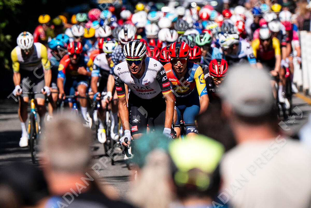 Nils Politt, of Germany, riding for the UAE Emirates, leads the pack while competing in the UCI Montreal Grand Prix Cycling race in Montreal on Sunday, Sept. 14, 2025. THE CANADIAN PRESS/Christopher Katsarov