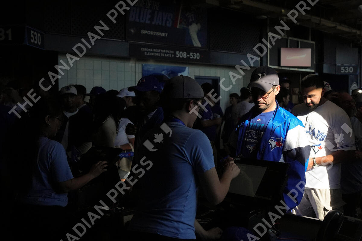 Fans make purchases in the concourse during Game 1 of the ALDS MLB baseball series in Toronto, between the Toronto Blue Jays and the New York Yankees, on Saturday, Oct. 4, 2025. THE CANADIAN PRESS/Chris Young