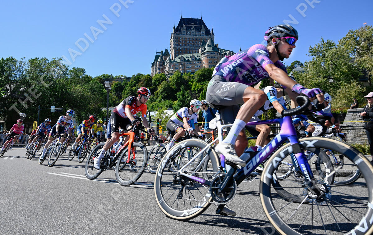 The main pack races on Boulevard Champlain at the Grand Prix Cycliste de Quebec, Friday, September 12, 2025 in Quebec City. Tadej Pogacar of Slovenia, centre in white, cycles alongTHE CANADIAN PRESS/Jacques Boissinot