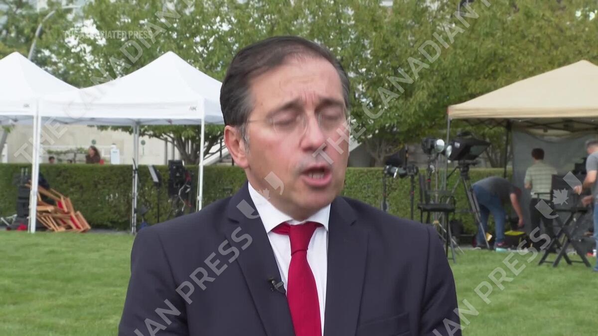 Spain’s top diplomat dismissed Israeli Prime Minister Benjamin Netanyahu’s statement that there will never be a Palestinian state, saying Israelis will one day want to live side-by-side in peace with Palestinians. (AP Video by Joseph B. Frederick)