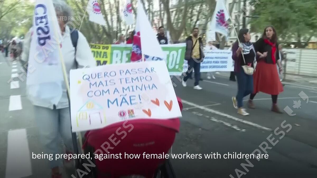 Tens of thousands of people in Lisbon took to the streets of Portugal's capital to protest a package of labor reforms proposed by the government, calling for a monthly minimum wage of 1,050 euros ($1,214) in 2026. (AP video by Helena Alves)