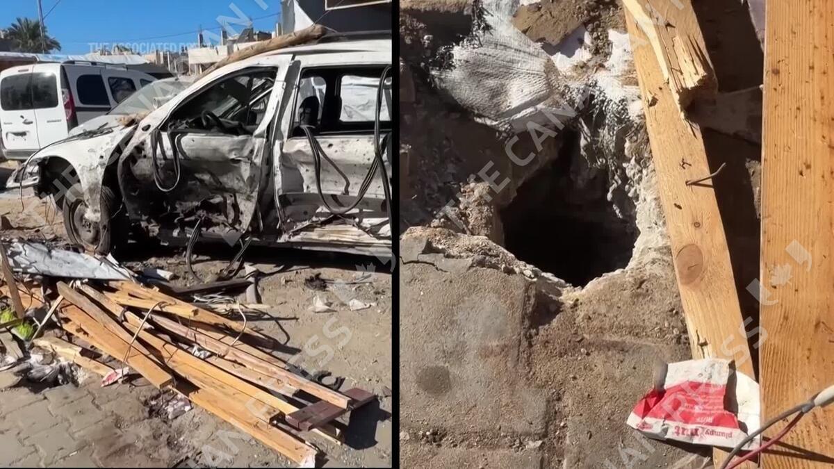 A strike hit a tent in the courtyard of Al-Aqsa Martyrs hospital in Gaza's central town of Deir al-Balah, seriously injuring two people, hospital staff said. (AP video by Wafaa Shurafa)
