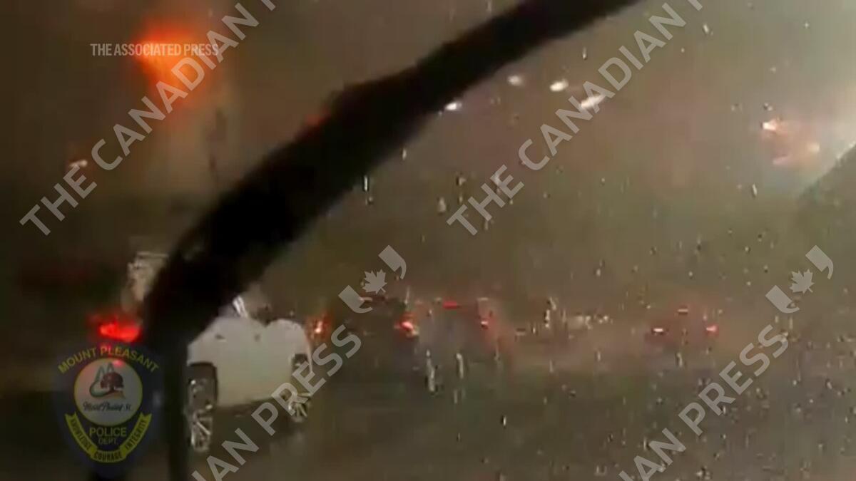 A police car's dashboard camera caught the moment a lightning bolt struck power lines in Mount Pleasant, sparking a fireball along a busy road and knocking out power.