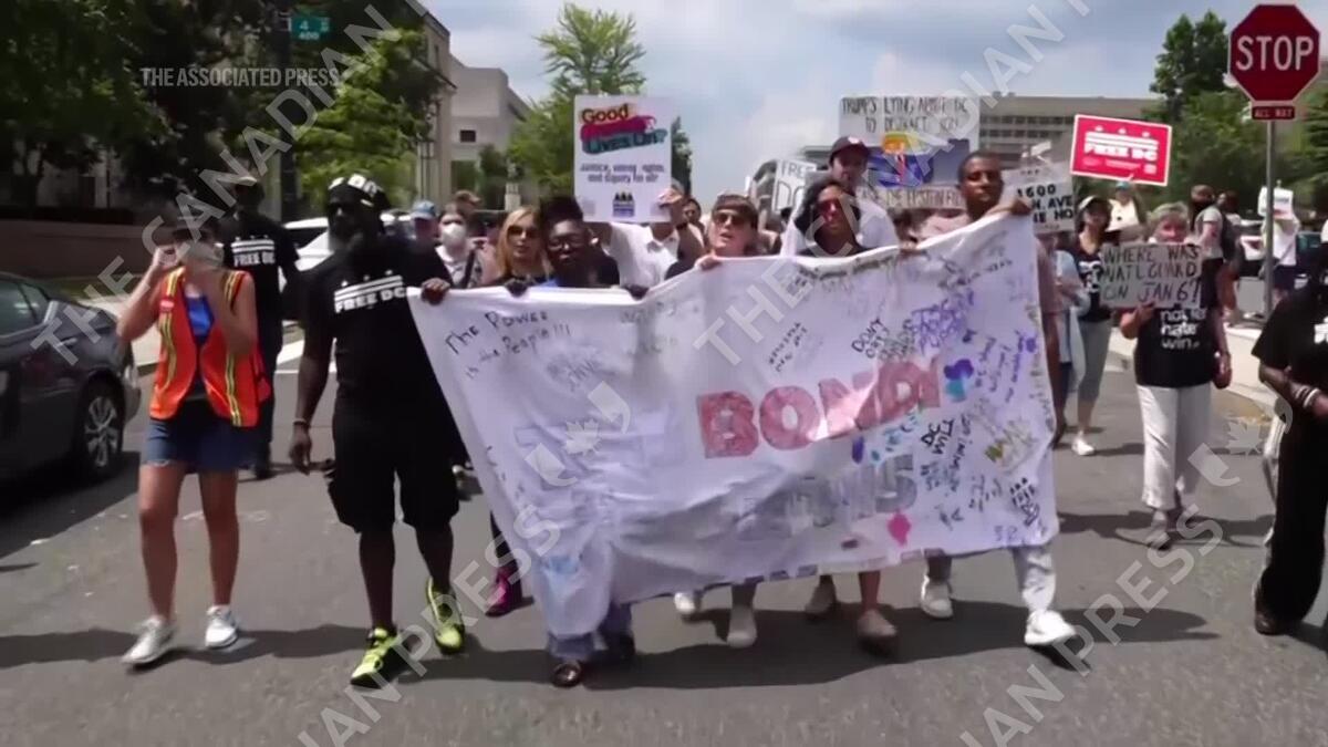 Dozens of Washington, DC protested outside the Metropolitan Police Department and the DC federal courthouse on Friday as city officials sued to block President Donald Trump’s takeover of the police department in the nation's capital. (AP Video by Mike Pesoli)