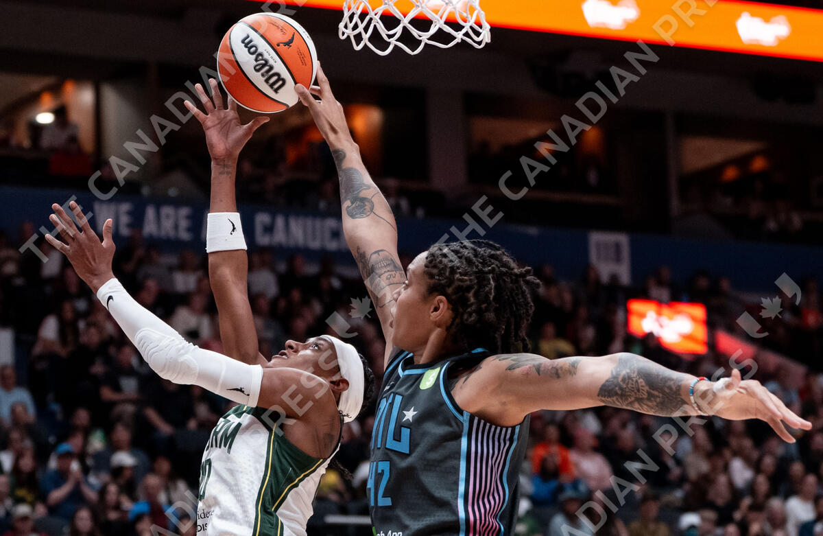 Atlanta Dream's Brittney Griner (42) knocks the ball from Seattle Storm's Brittney Sykes's (20) hand as she drives for a lay-up during the first half of a WNBA basketball game in Vancouver, B.C., on Friday, August 15, 2025. THE CANADIAN PRESS/Ethan Cairns